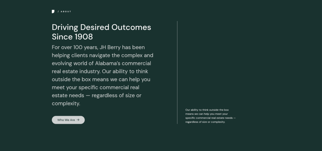 JH Berry needed their website copy to communicate exactly what they do — and fast. They wanted visitors to immediately understand that they help businesses lease, buy, and sell commercial real estate. On top of that, the site had to build trust. With over a century in the industry, their team had the experience — but their existing branding didn’t reflect it.